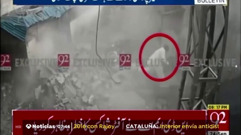 Un hombre sale ileso tras caerle los escombros de un edificio en pleno terremoto de Pakistán