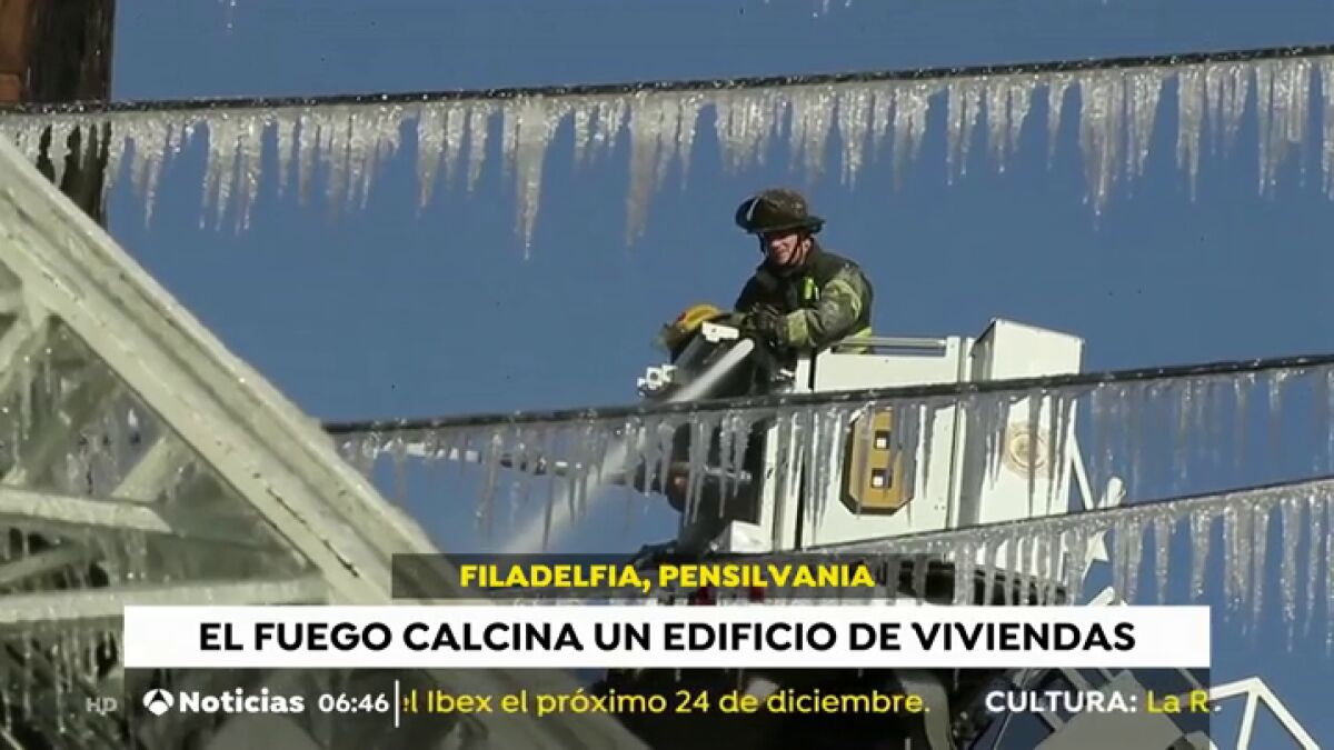 El fuego ha calcinado un edificio residencial de Filadelfia. Cerca de 60 vecinos han tenido que ser desalojados por las llamas y dos bomberos ha resultado heridos. Los efectivos han tenido que trabajar con temperaturas bajo cero que han llegado a congelar hasta el agua.