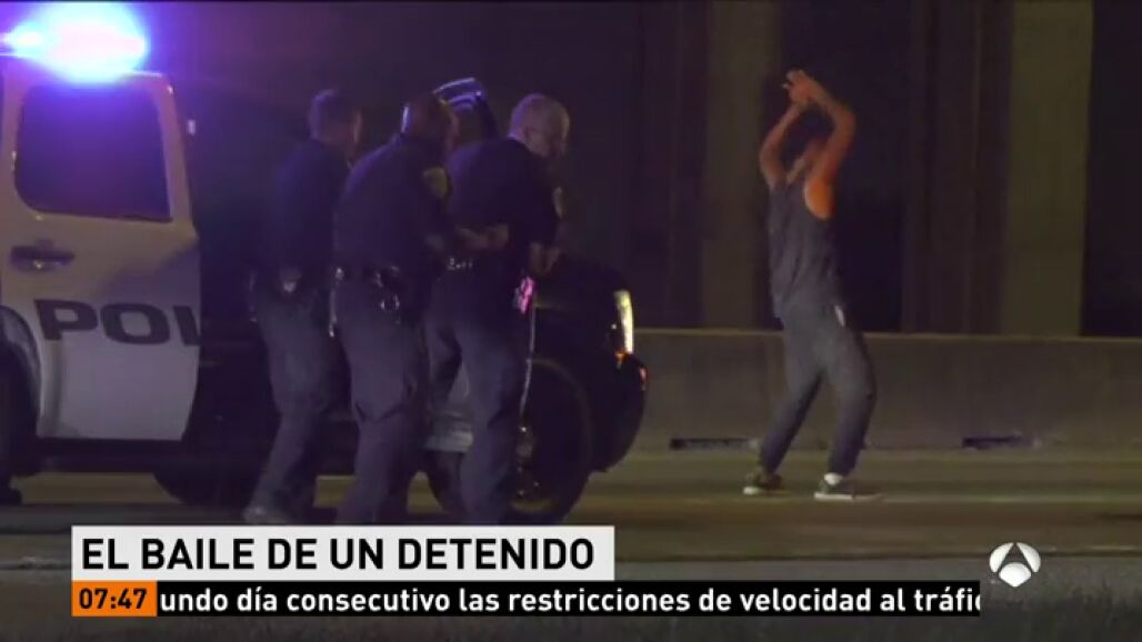 La policía de Houston logró detener al hombre después de perseguirlo durante más de 30 kilómetros. El sospechoso obedece las órdenes de los agentes y se baja del automóvil, pero en vez de tumbarse en el suelo, se toma su detención como una broma y, con los brazos en alto, comienza a bailar.