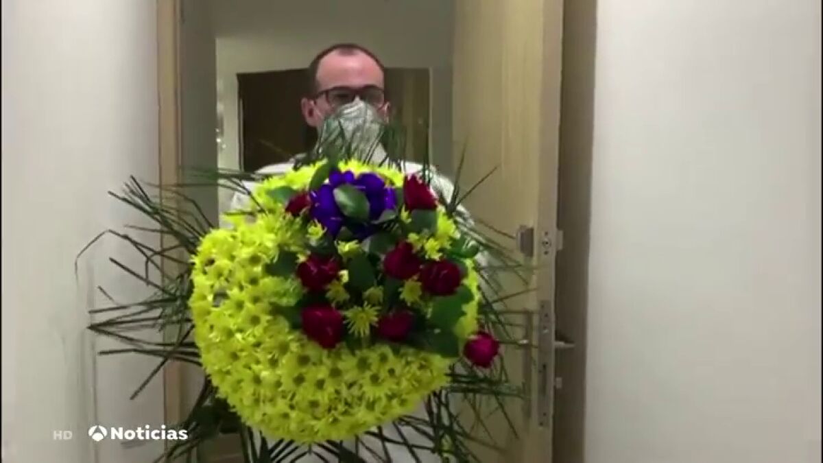 El médico ha grabado un vídeo en el que se ve como sostiene una de las coronas fúnebres que asegura que le están mandando tras la muerte de una paciente con coronavirus.