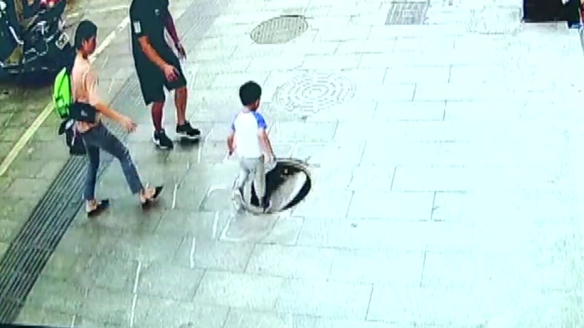 Unos padres y su hijo se llevaron el susto de su vida cuando el pequeño cayó al vacío por una alcantarilla al no estar fijada la tapadera que la cubría en una ciudad de China.