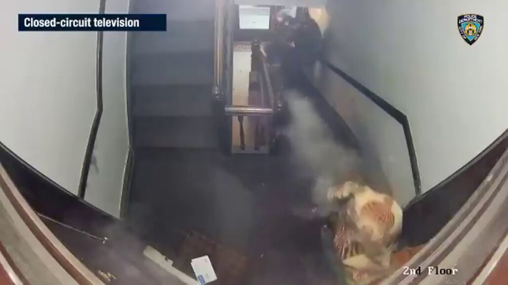 El tiroteo tuvo lugar en las escaleras de un edificio de Brooklyn: el hombre sale envuelto en una manta y dispara a bocajarro a los policías. Dos agentes terminaron en el hospital.
