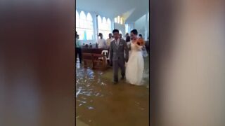La novia y sus padres avanzaron por el pasillo inundado a través de aguas turbias hasta el novio descalzo que estaba esperando junto al altar.