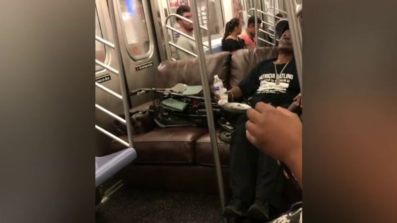 Dos pasajeros del metro deciden llevar su propio sofá al vagón del metro de Nueva York y sentarse en él, los demás pasajeros, asombrados, no dudan en poner en marcha sus cámaras para grabar ese momento.