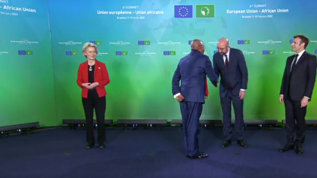 El general Jeje Odongo, ministro de Exteriores de Uganda, ha cumplido a medias con el protocolo, puesto que ha saludado a Charles Michel y a Emmanuel Macron, pero ha ignorado en primera instancia a Ursula von der Leyen, en un vídeo que ya se ha hecho viral en las redes sociales, y que muestra con cara de sorpresa a la presidenta de la Comisión Europea.