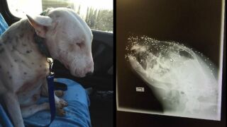 Un centro de acogida de animales de Reino Unido ha publicado unas impactantes imágenes muestran el daño causado a un perro indefenso que fue disparado en la cabeza con una escopeta. Eric, un bull terrier Inglés, tiene más de 50 perdigones de plomo incrustados debajo de su piel.