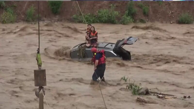 VÍDEO: Agónico rescate a una pareja atrapada por la crecida de un río en China
