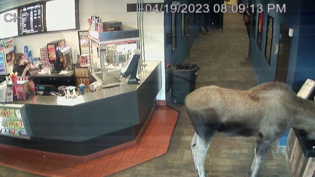 Este lunes, los trabajadores de un cine en Alaska quedaron totalmente asombrados cuando un alce se coló en la entrada para quedarse durante cinco minutos.