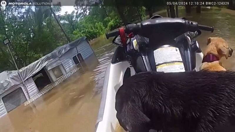 Las imágenes muestran el recate de un hombre, un vecino, de un pueblo del norte de Houston, y de otros tres perros. La Policía escuchó los gritos de auxilio y acudió al lugar en una moto acuática para sacarles de una mezcla de agua y fango de casi tres metros de profundidad.