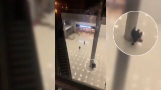 Otro vídeo muestra cómo dos personas se ocultan detrás de una columna para esquivar los disparos de los terroristas que está ocurriendo a escasos metros.