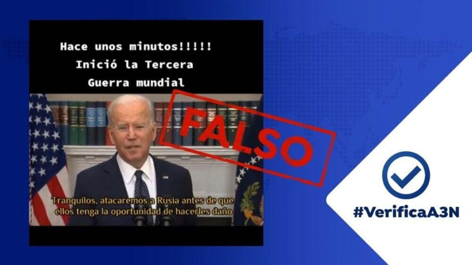 Los bulos sobre la ofensiva de Rusia en Ucrania aumentan en redes sociales. Desde Verifica A3N desenmascaramos los bulos más extendidos de esta guerra como este del presidente Joe Biden diciendo que atacará Rusia.