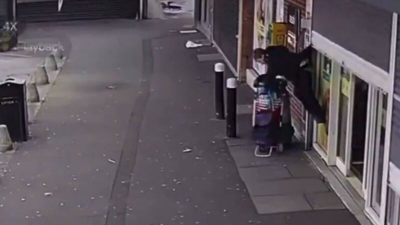 Una mujer fue sorprendida en Reino Unido por la persiana de un supermercado, que se enganchó a su abrigo y la alzó.
