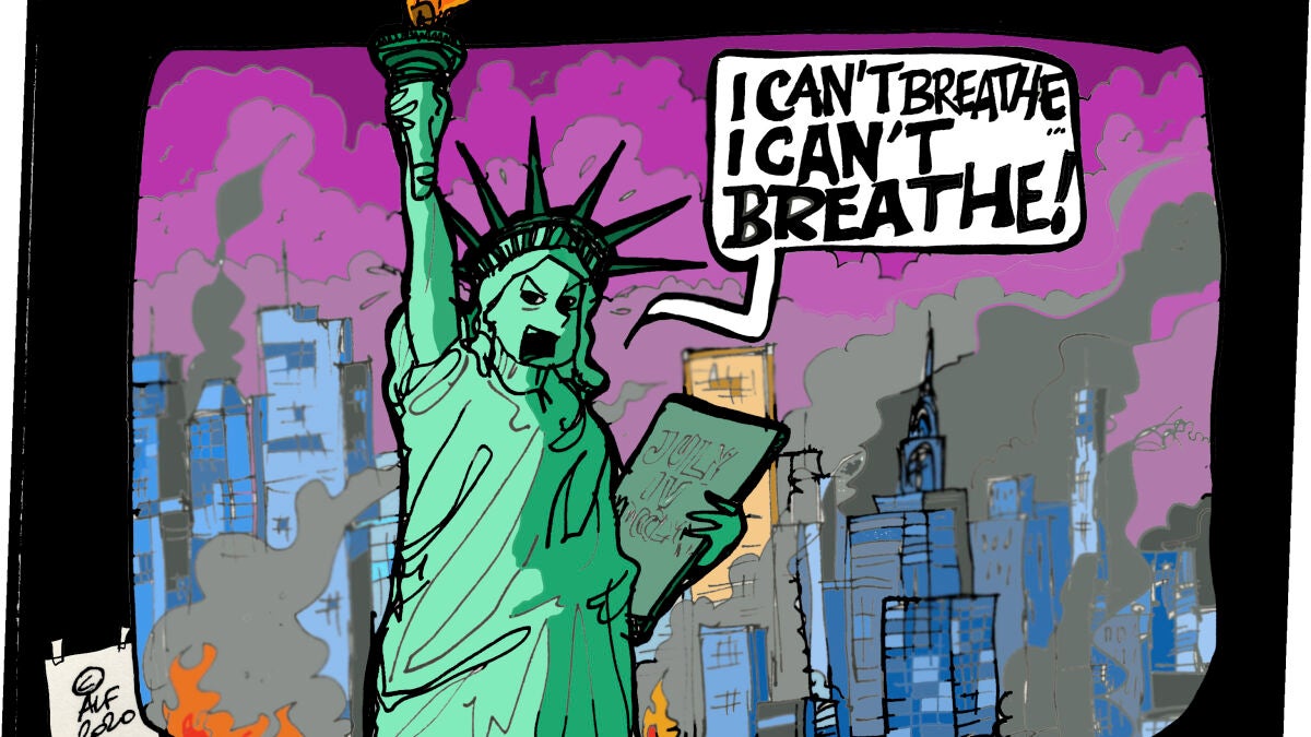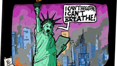 Nuestro ilustrado Alfredo Boto-Hervás ha abordado esta complicada situación. En su ilustración se ve a la Estatua de la Libertad con un rostro enfadado mientras grita "no puedo respirar".