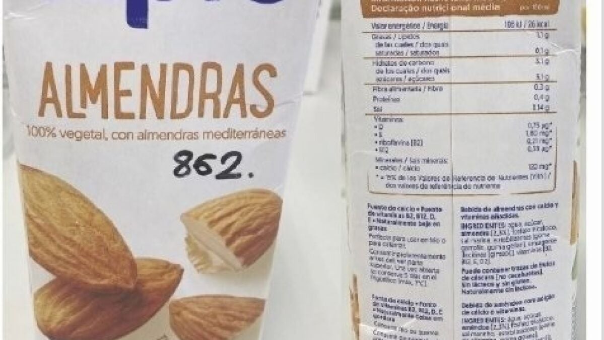 Se trata concretamente del envase "Bebida de almendras" que comercializa Alpro y distribuye en bricks de 1 litro con número de lote L 320.2 0 y fecha de consumo preferente 16/08/23. El producto indica en el etiquetado que debe conservarse a temperatura ambiente y que "puede contener trazas de frutos de cáscara (no cacahuetes)", diciendo también que está elaborado "sin lácteos y sin gluten".