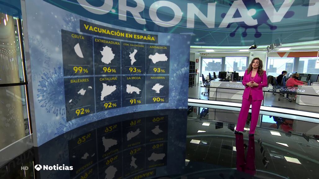 Por comunidades, Ceuta se encuentra en cabeza con el 99% de las vacunas administradas. Le sigue Extremadura con el 96%, la ComunidadValenciana con el 93%, Andalucía con el 93% también o Baleares con el 92%.