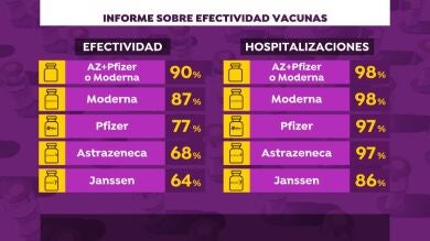 Si bien es cierto que todas las vacunas evitan casi en el 100% de los casos los ingresos y las muertes por Covid-19, este informe concluye que el porcentaje de Janssen es un poco inferior. En concreto, del 86% de hospitalizaciones y el 89% de defunciones. Las otras tres vacunas tienen una oscilación entre el 98% y el 94%.
