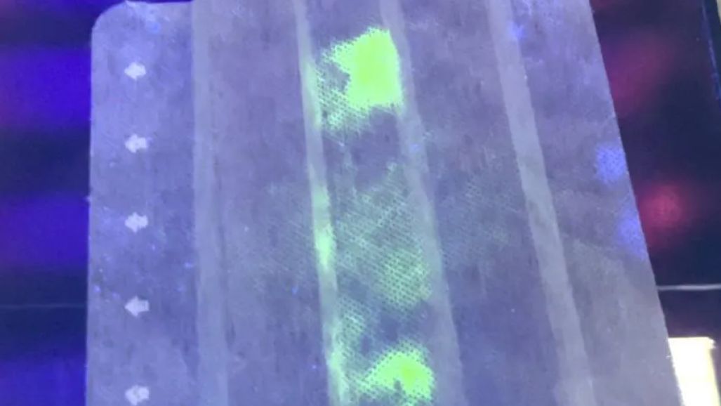 Cuando el filtro se rocía con un tinte fluorescente, brilla, siempre que haya rastros del coronavirus y así se ilumina con luz ultravioleta.