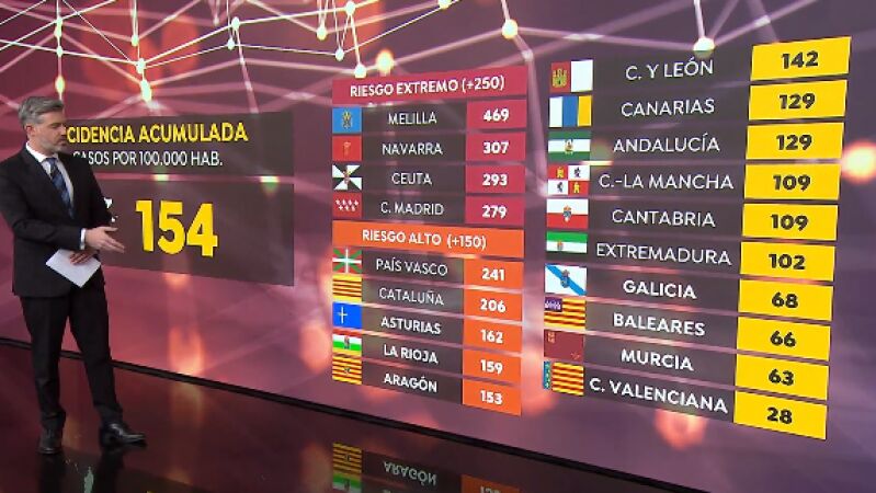 La incidencia acumulada ya se sitúa en 154,7 casos por cada 100 mil habitantes, dos puntos más que este jueves. Navarra, Madrid, Ceuta y Melilla siguen en riesgo extremo. Aragón y La Rioja empeoran sus datos y ya están en riesgo alto. Por Su parte, la Comunidad Valenciana sigue con la incidencia más baja del país.