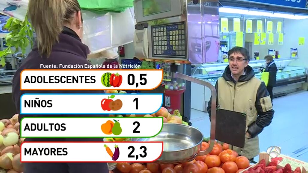 La OMS recomienda consumir dos piezas de hortalizas y tres de frutas diarias, no obstante, los españoles consumimos 1,8 piezas de hortalizas y 1,5 de fruta diaria. Los expertos instan a tomar más fruta, a poder ser de temporada, y explican que el mejor momento para consumirlas es por las mañanas o entre horas.