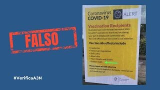 Sin embargo, el cartel no pertenece a ningún organismo oficial, se trata de un montaje. El diseño de esta imagen engañosa es muy similar a las que utilizan de manera oficial desde el Departamento de Salud de Irlanda como se puede comprobar en su web oficial y perfiles en redes sociales. Además, el cartel indica que "por favor se reporte cualquier efecto secundario a la Agencia Reguladora de Productos Sanitarios (Health Products Regulatory Authority)", el organismo encargado de la regulación de los medicamentos en el país. En declaraciones a la agencia Associated Press, desde HPRA aseguran que este cartel no es de la autoridad reguladora de Irlanda y que es falso.