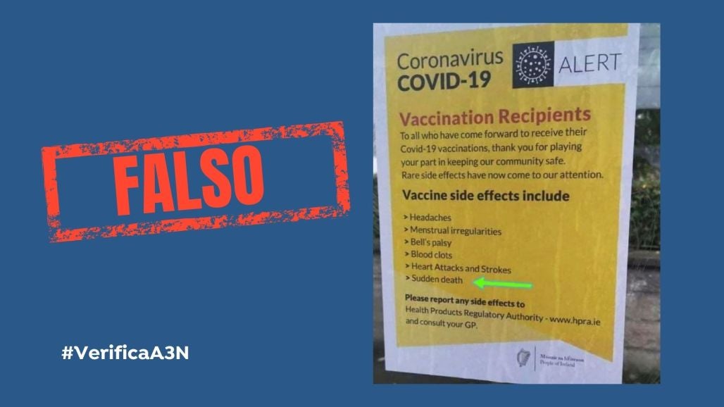 A través de redes sociales se siguen viralizando cada día diferentes bulos y desinformaciones relacionadas con la pandemia del coronavirus y las vacunas contra el COVID-19. Este último habla sobre la muerte súbita como efecto secundario, algo que es completamente engañoso, como el cartel que se está compartiendo. Todos los detalles en una nueva entrega de Verifica A3N.