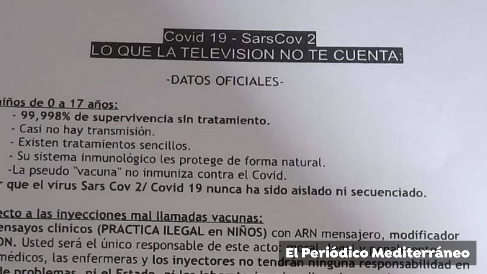 En esta especie de carta plasman una serie de datos para hacer ver a la población no solo que las vacunas no son necesarias, sino que provocan algunos efectos sobre el organismo. "Respecto a las inyecciones mal llamadas vacunas: son ensayos clínicos (PRÁCTICA ILEGAL en NÑOS) con ARN mensajero, modificador del ADN. Usted será el único responsable de este acto: moral, legal y penalmente", escriben.