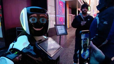 Este robot, que ha salido a la calle en Times Square (Nueva York), cuenta con una pantalla táctil que va pegada en su pecho y en la que los curiosos pueden responder un pequeño cuestionario.