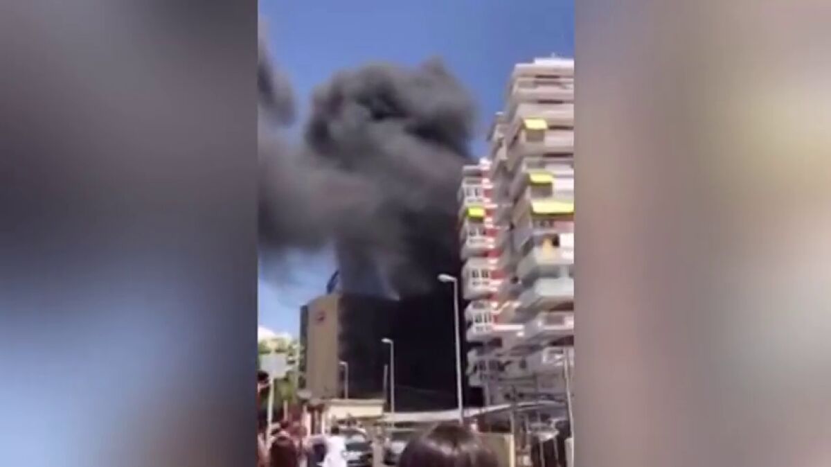 Varios testigos han grabado la gran columna de humo y las llamas que salían del parking de un hotel de Benicássim, en Castellón, que se ha incendiado a mediodía de hoy.
