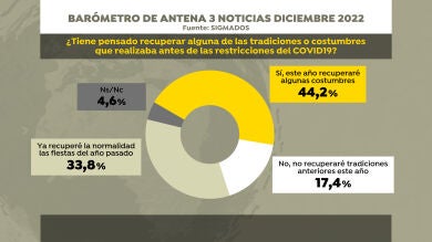 Los españoles están disfrutando de estas Navidades de 2022 como solían hacerlo antes de la pandemia de Covid-19. De hecho, según la última encuesta de SigmaDos para Antena 3 Noticias, el 44,2% de los encuestados dice que estas primeras fiestas sin las restricciones servirán para recuperar algunas de las tradiciones y costumbres que realizaba antes de las restricciones. Se suman al 33,8% que asegura que ya volvió a la normalidad en las fiestas de 2021, por lo que en total, un 78% de los españoles ha dejado atrás las distancias de seguridad y los límites en las reuniones familiares.