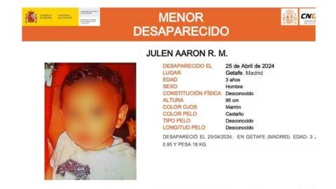 La asociación SOS Desaparecidos y el Centro Nacional de Desaparecidos (CNDES) había divulgado su imagen y los datos del pequeño para facilitar su búsqueda. Según EFE, fuentes de la Jefatura Superior de la Policía de Madrid señalaron que el nio, Julen, estaba en todo momento junto a su madre en una vivienda de Getafe.