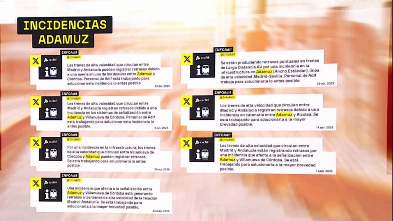 Aunque todavía es pronto para sacar conclusiones, en ese mismo tramo de Adamuz, Adif había detectado ocho incidencias desde la primavera, unos avisos relacionados con la catenaria, la señalización y la propia infraestructura, y por los que el Partido Popular llegó a preguntar en el Senado en el mes de septiembre. A lo que el Gobierno contestó que "la tarjeta afectada fue sustituida por una nueva, y se restableció la operatividad del sistema".