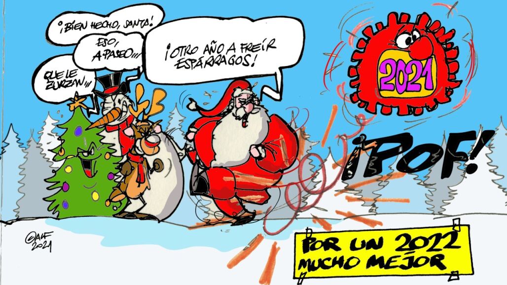 El adiós al 2021 es el protagonista de la nueva viñeta gráfica de nuestro ilustrador Alfredo Boto-Hervás. El pasado año también ha estado marcado por el coronavirus y España afronta este 2022 con la esperanza de que esta situación comience a cambiar de verdad.