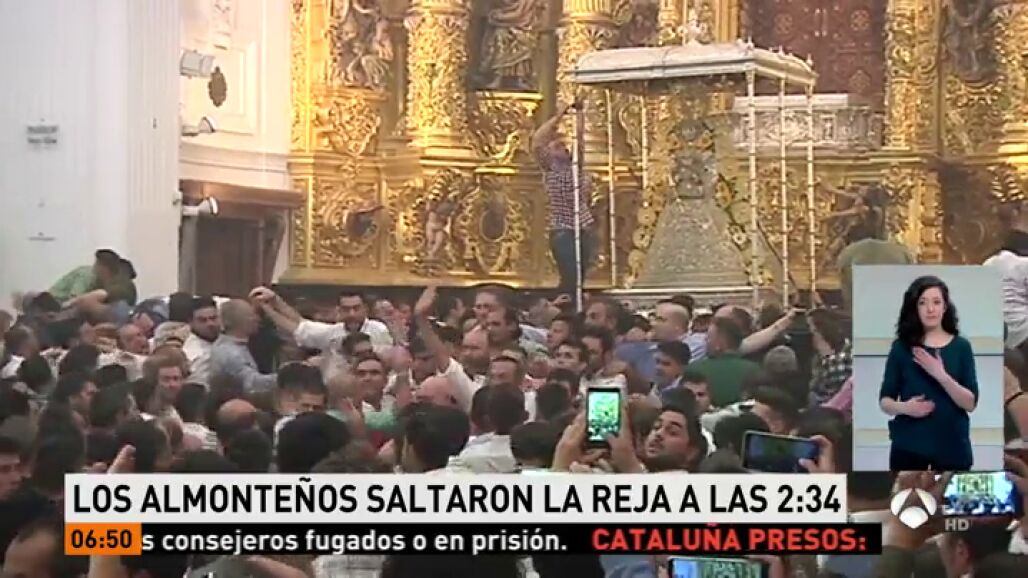 Esta madrugada, a las 2:34 horas, los almonteños han saltado la reja que los separaba de la Blanca Paloma, y como siempre se ha vivido con mucha emoción. Ha sucedido casi una hora antes que el año pasado y sin esperar a que termine el rezo del rosario.