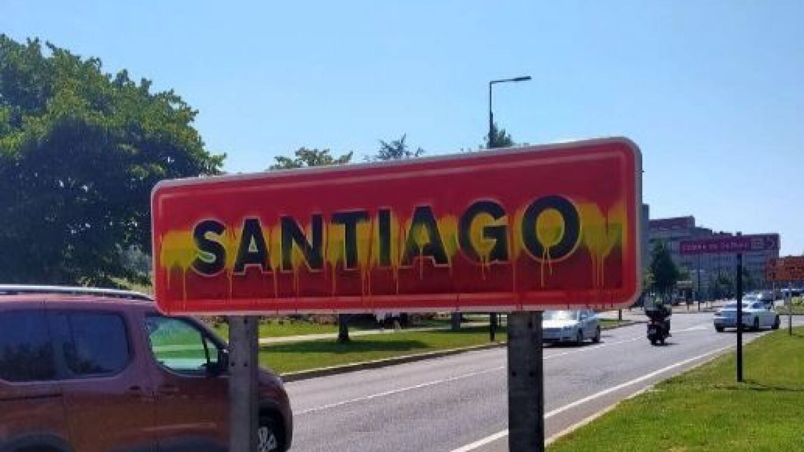 En concreto, el cartel que ha sido vandalizado se encuentra en la entrada a Compostela por San Lázaro, por donde acceden a la ciudad los peregrinos que realizan en Camino Francés a Santiago y que, en las últimas horas, se han encontrado con un acto vandálico en que los artífices utilizaron los colores de la bandera de España para tapar los que simbolizan al colectivo LGTBIQ+. Otros dos letreros que indican la entrada en la capital gallega por distintos puntos también habían sido pintados con los colores de la bandera arcoíris.