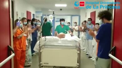 Aplausos para un paciente que ha pasado 80 días en la UCI por el coronavirus en Madrid