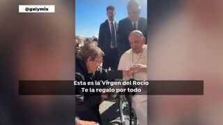 La señora andaluza esperaba sentada en la zona habilitada para que el Papa pasara delante de ella. En ese momento, cuando pasaba en la silla de ruedas cerca de ella, lo saludó con ilusión y no dudó en darle un obsequio (la estampa de la Virgen del Rocío). "Esta es la Virgen del Rocío. Te la regalo por todo", explicaba la mujer antes de besarle la mano.