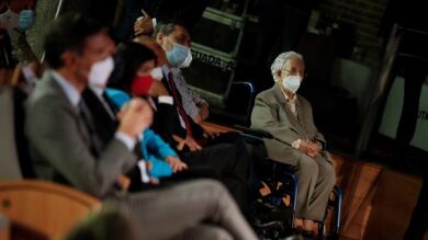 Esta mujer ha acudido al acto que ha presidido Pedro Sánchez, el presidente del Gobierno, en Guadalajara con motivo de haber alcanzado el 70% de la vacunación en España. En su visita, ha recorrido las instalaciones del Servicio de Vacunación Centralizado de Guadalajara, acompañado por Carolina Darias, ministra de Sanidad, y el presidente de Castilla-La Mancha, Emiliano García Page.