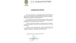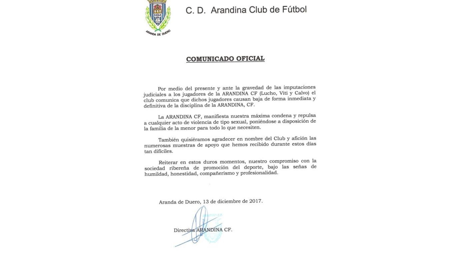 La Arandina Club de Fútbol ha comunicado este miércoles, a través de una nota de prensa, que expulsa del club a los tres jugadores que fueron detenidos como supuestos autores de un delito de agresión sexual cometido contra una chica de 15 años. La entidad deportiva ha subrayado que "ante la gravedad de las imputaciones judiciales a los jugadores de la Arandina CF (Lucho, Viti y Calvo) el club comunica que dichos jugadores causan baja de forma inmediata y definitiva de la disciplina del club".