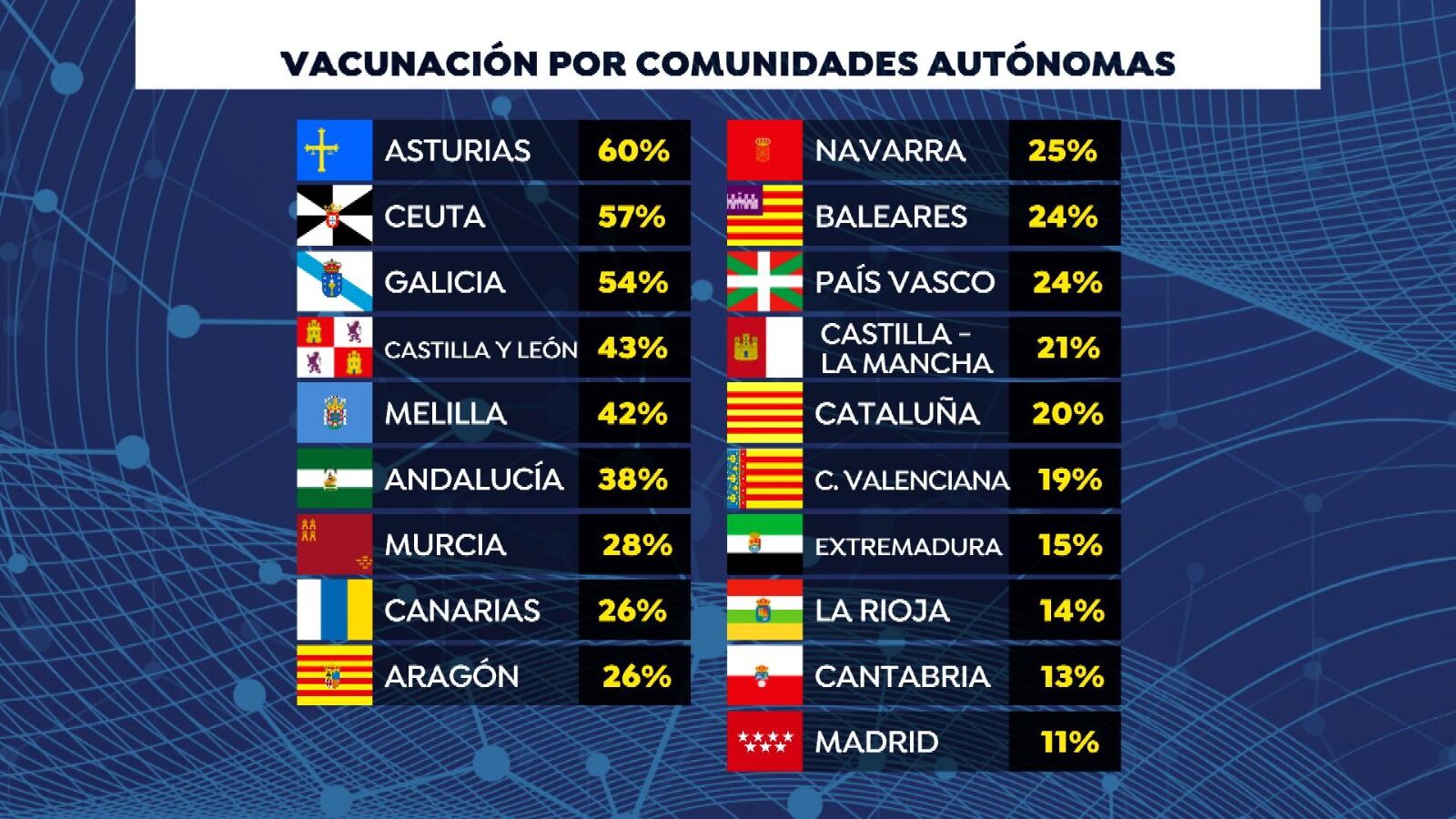 A la cola se encuentran la Comunidad Valenciana con el 19,1% al administrar 11.677 vacunas contra el coronavirus de las 61.225 que tienen hasta la fecha. Extremadura solo ha suministrado 15,2% de las dosis facilitadas por Sanidad, es decir, 3.309 de 21.725; La Rioja ha suministrado el 14,5% de las dosis que tiene actualmente, 858 de las 5.915. Cantabria cuenta con un 13,2% de las dosis administradas, con 1.564 de 11.850.