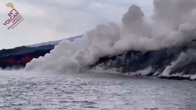 En su contacto con el agua, el sonido es intenso. También la columna de gases que provoca la lava del volcán de La Palma al entrar en contacto con el mar. “La lava a sus 800 grados cae al mar y ese choque térmico provoca esas emanaciones de vapor de agua, pero luego tiene toques más amarillentos de otros gases” ha indicado Rubén López, un vulcanólogo del IGN.