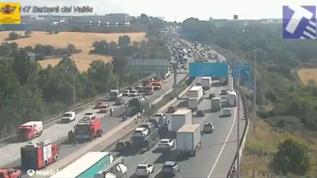 El incendio de un camión cisterna en la AP-7 a la altura de Barberá del Vallés (Barcelona) origina un nuevo atasco en la autovía con colas de hasta 20 kilómetros desde la Roca del Vallès con coches parados y algunos conductores fuera de los vehículos.