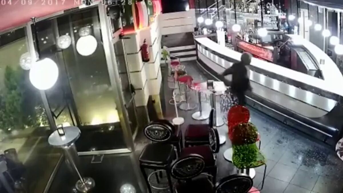 Un hombre, con capucha y la cara tapada, rompe una de las puertas y logra entrar. En ese momento, estaba en el interior del bar una trabajadora la limpieza que huyó por otra puerta.