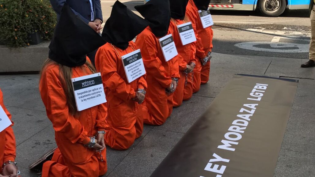 No ha sido la única forma de denuncia de la asociación, que ha presentado, también ante el edificio de la Cámara Baja, a seis personas vestidas con un mono naranja, una capucha negra en la cabeza y esposas en las muñecas.
