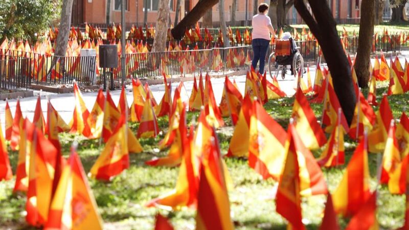 A esa altura, donde se ubica también la comandancia y casa cuartel de la Guardia Civil, han colocado sobre el césped una bandera de España más grande bajo un gran lazo blanco en el que se lee: "Justicia víctimas del coronavirus".