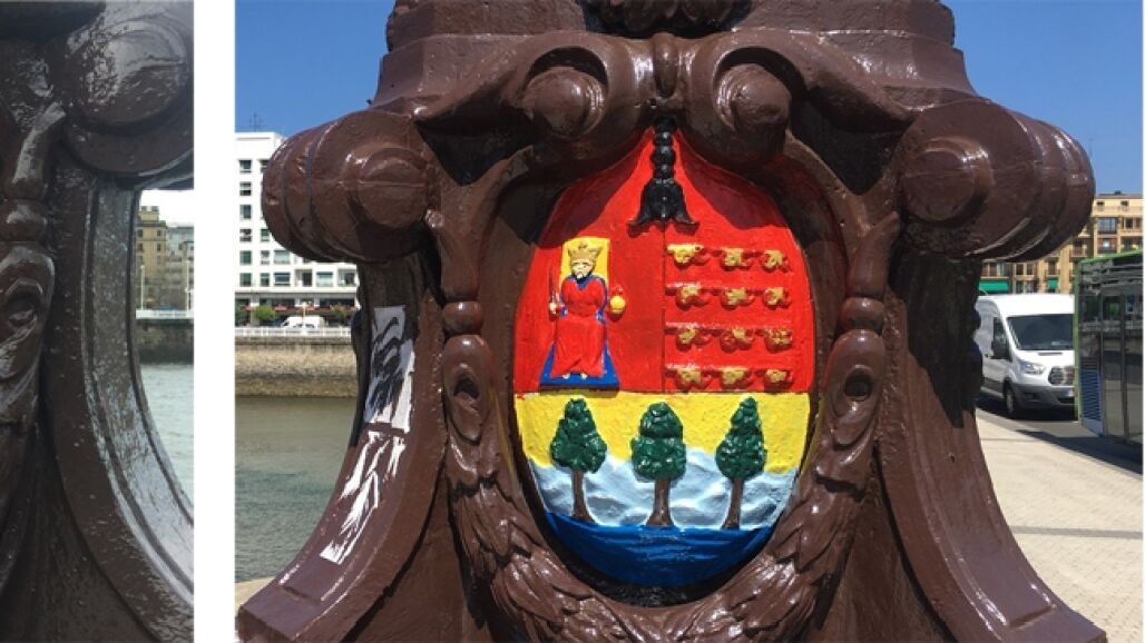 El Ayuntamiento estudiaba acometer una rehabilitación artística a cargo de especialistas cuando la empresa contratada para restaurar el alumbrado se le adelantó y, sin permisos ni control municipal, comenzó a pintar los escudos ubicados en las farolas del Puente de Santa Catalina en San Sebastián.