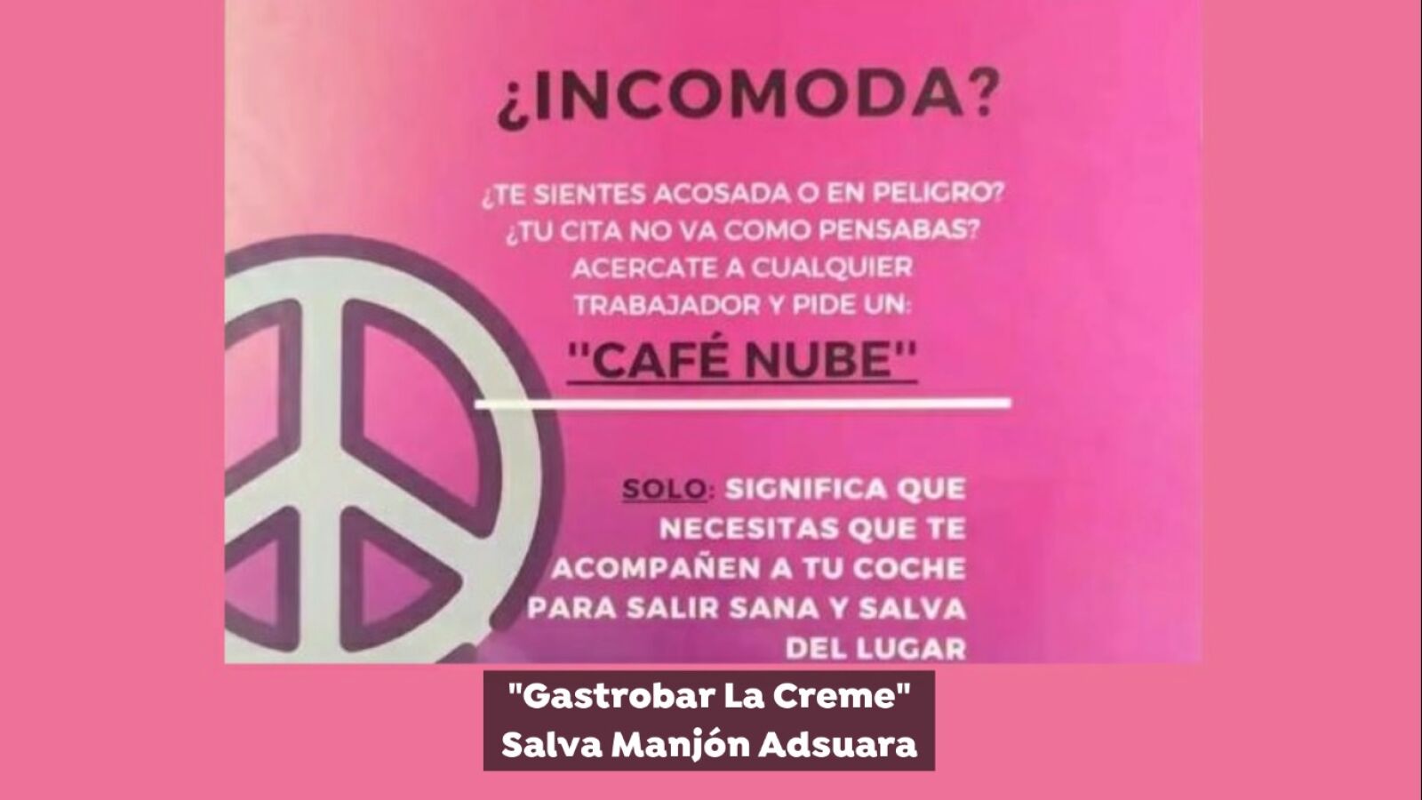 El Gastrobar La Crême de Granada ha creado una iniciativa con la que pretenden aportar su granito de arena contra la violencia machista. Pedir un café 'nube' en este establecimiento tiene un significado especial. Todas aquellas mujeres que lo hagan recibirán la ayuda de los trabajadores de la cafetería. Si una cita no va bien, en este lugar las mujeres podrán sentirse seguras.