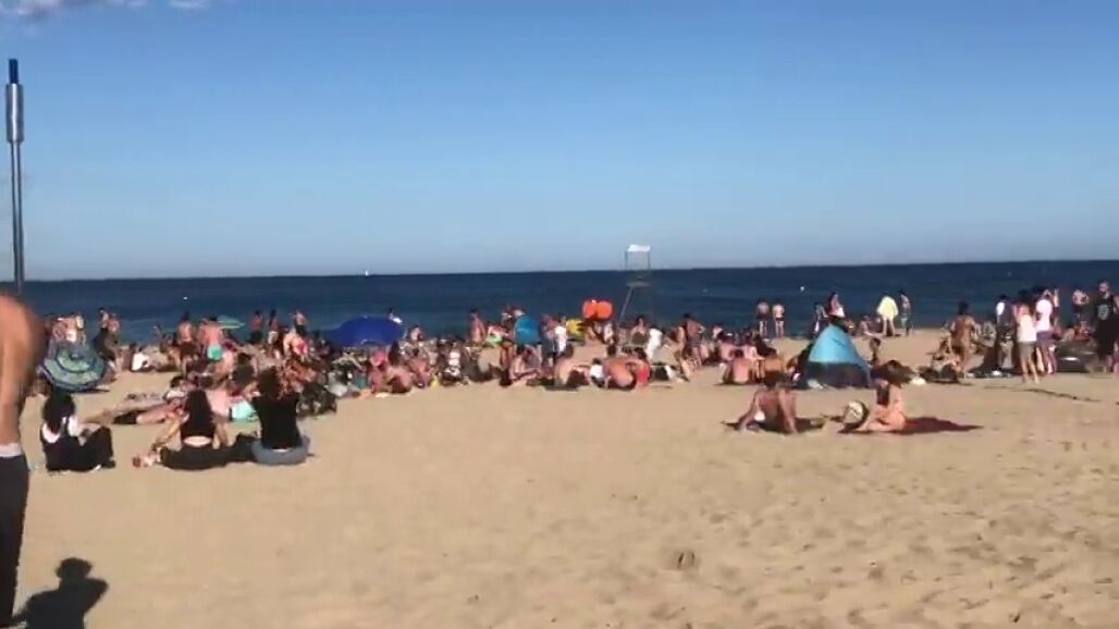El aforo permitido en las playas de Barcelona es del 80%, un límite que se ha alcanzado en las playas de la Nova Icària y del Bogatell . Los agentes han informado por megafonía a los bañistas.