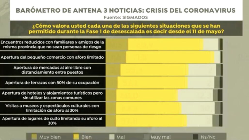 El barómetro de Antena 3 Noticias elaborado por Sigma Dos recoge la opinión de los encuestados sobre la crisis sanitaria por el coronavirus durante la fase 1 de la desescalada.