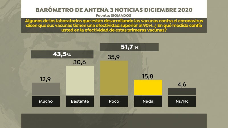 En el día en que Reino Unido ha comenzado a distribuir la vacuna de Pfizer, los datos del barómetro de SigmaDos para Antena 3 Noticias revelan que los españoles no están seguros de la eficacia de la vacuna.