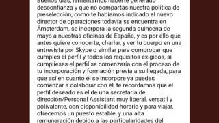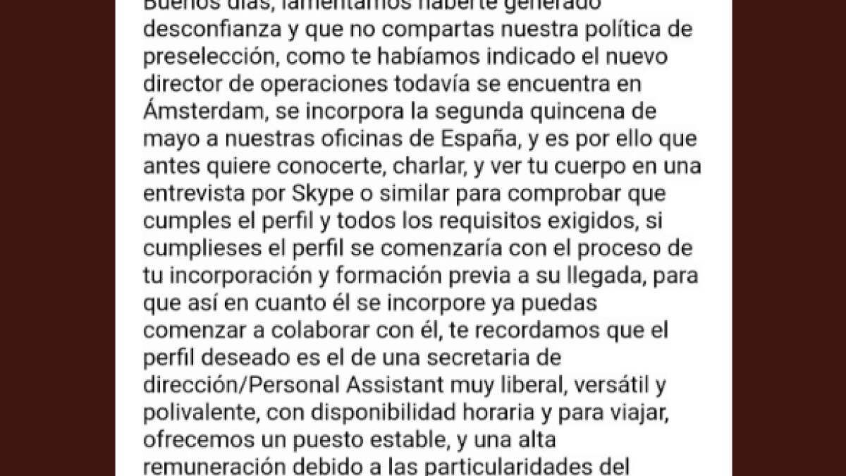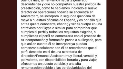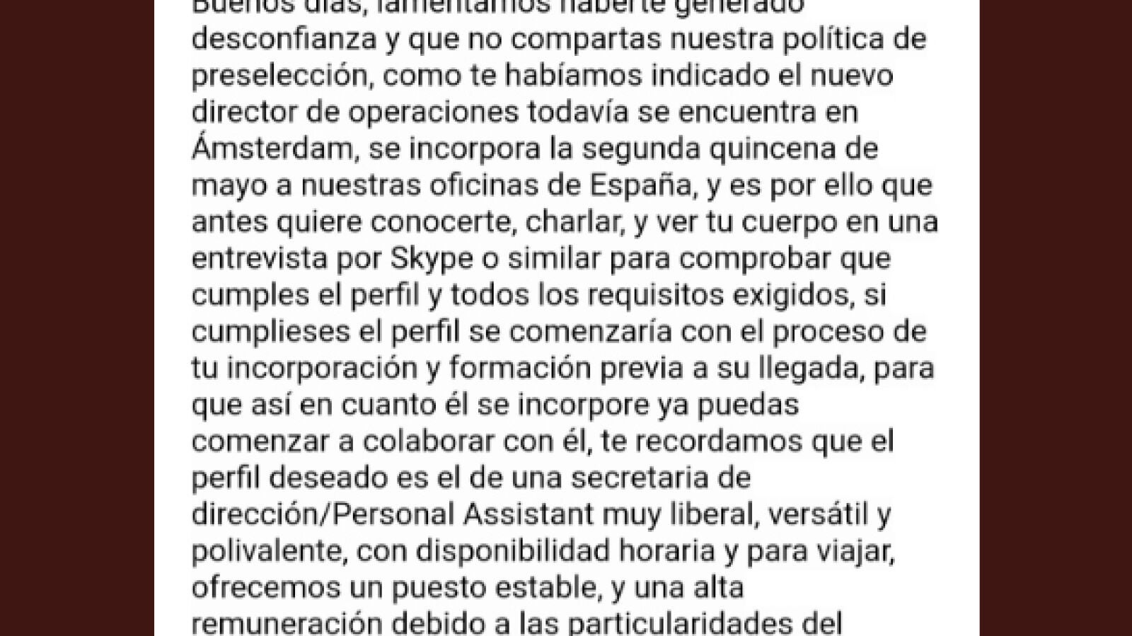 Posteriormente y también a través del mail, la empresa se vuelve a poner en contacto con @Relatofeminista lamentando "haber generado desconfianza" y le informa de que "el nuevo director de operaciones todavía se encuentra en Ámsterdam, se incorpora la segunda quincena de mayo a nuestras oficinas en España y es por ello que antes quiere conocerte". Le llegan incluso a proponer una entrevista por Skype para "comprobar si cumple el perfil".